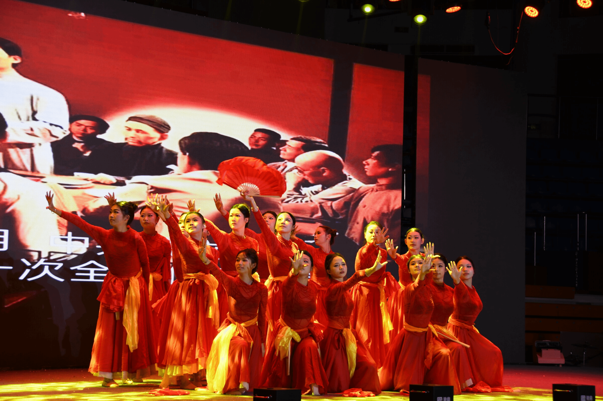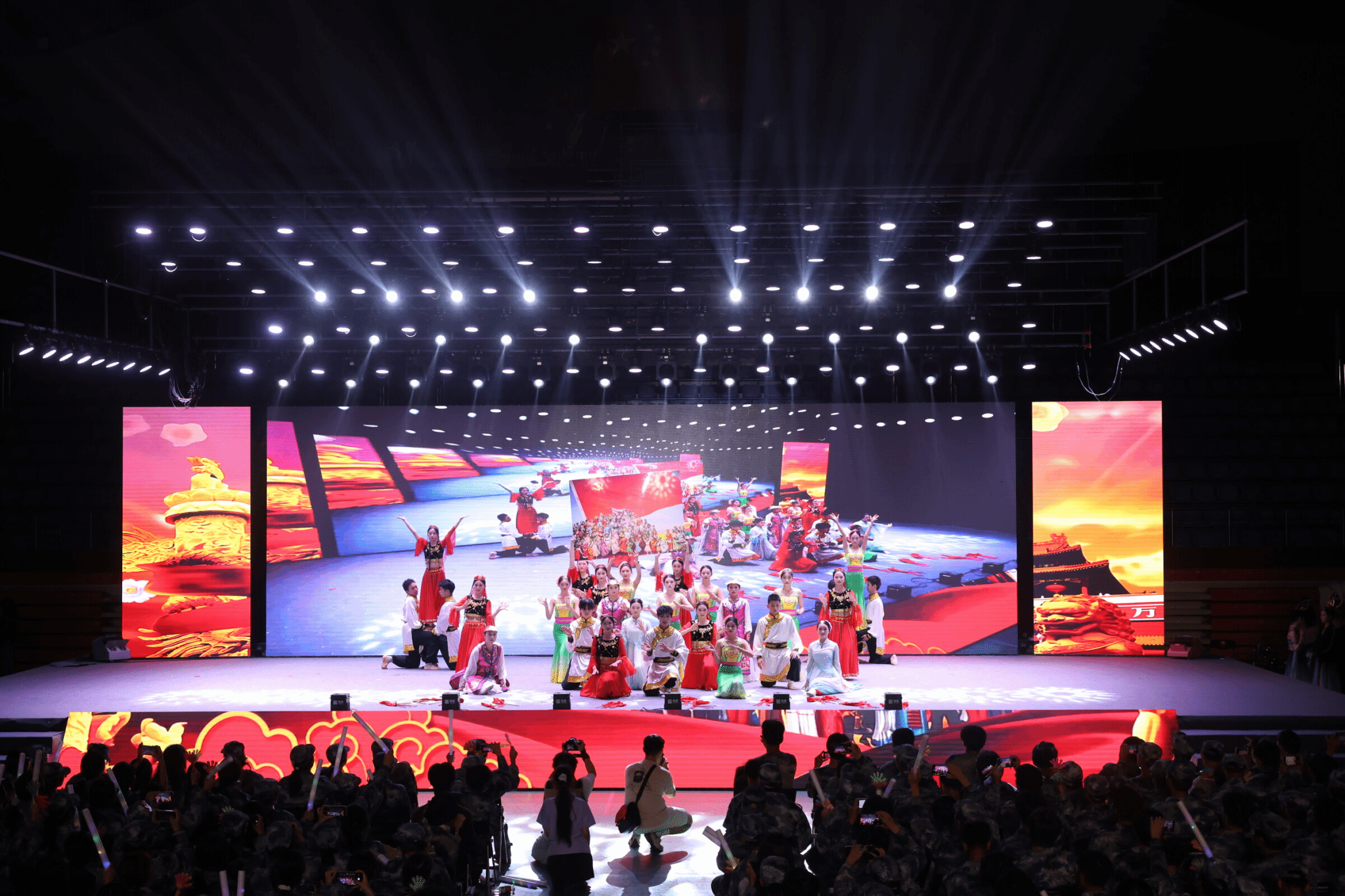 各院系师生及教官团队先后呈现了《像你这样的朋友》《梦回红楼》《旗开得胜》《民族团结一家亲》《智启未来》《敦煌乐鼓》等精彩节目。辅导员团队的朗诵《致新程》温情寄语新生,教官歌舞《改变自己》拉近与学生的距离,全体合唱《歌唱祖国》将现场气氛推向高潮。