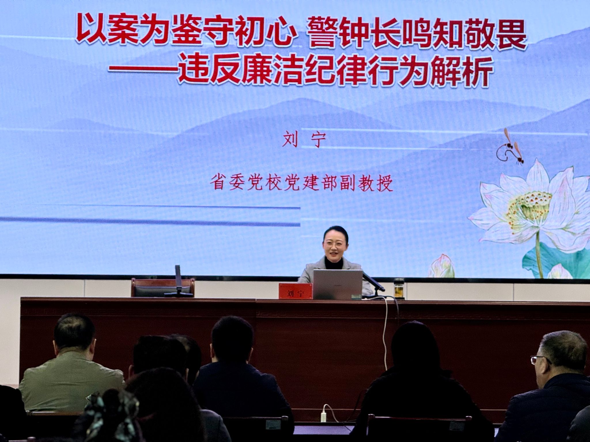 中共湖北省委党校(湖北省行政学院)党史党建教研部副教授刘宁作了题为《以案为鉴守初心 警钟长鸣知敬畏——违反廉洁纪律行为解析》的专题报告。她结合《中国共产党纪律处分条例》第八章对违反廉洁纪律行为的处分展开讲解,围绕“深刻认识廉洁纪律的重要性”“违反廉洁纪律的突出表现”“坚守廉洁底线的实践要求”等三个方面进行了系统阐述。
