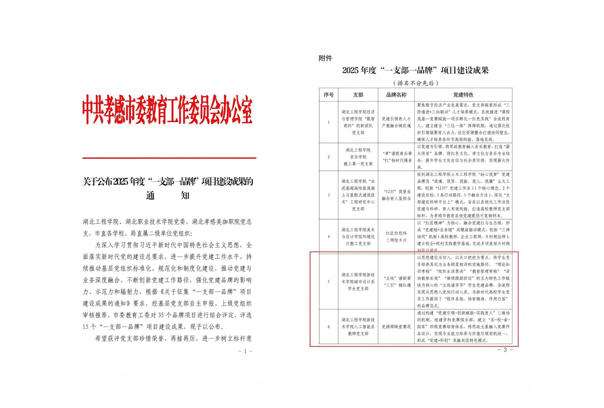 本网讯 近日,中共孝感市委教育工作委员会办公室公布2025年度“一支部一品牌”项目建设成果评选结果,我校城市设计系学生党支部申报的“五线谱新章,三引铸红魂”、人工智能系教师党支部申报的“党旗辉映竞赛花”党建品牌,在全市35个参评品牌项目中脱颖而出,双双成功入选市级党建品牌建设成果,充分彰显了我校基层党建工作的扎实成效与鲜明特色。